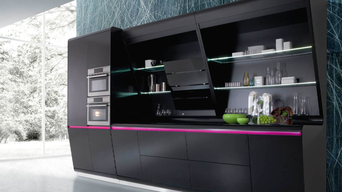 Колонны под холодильник, духовку и кухонный шкаф открываются с помощью выемки. Использование матового или глянцевого стекла для фасадов, а так же керамики позволяет представить модель в еще более эксклюзивном свете, подчеркнув её оригинальность и неповторимость.