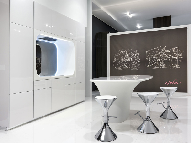 «В дизайне кухонь я следовал принципу минимализма, сочетая «чистые» поверхности с вкраплениями интенсивных цветов. В кухне Kook я трансформировал кулинарный поединок в чисто эстетическое удовольствие».