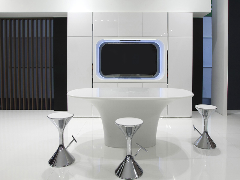 Концепция строится вокруг острова в форме пьедестала. Остров необычной формы приглашает семью и друзей занять свои места вокруг. Как смеситель, так и led-подсветка убираются под гладкую рабочую поверхность. Простое добавление разделочной доски многоцелевого использования над мойкой создаёт устойчивую поверхность, на которой можно накрыть стол. Мягкие изгибы имеют продолжение на блоке у стены. Настенная зеркальная панель также обрамлена led-подсветкой.