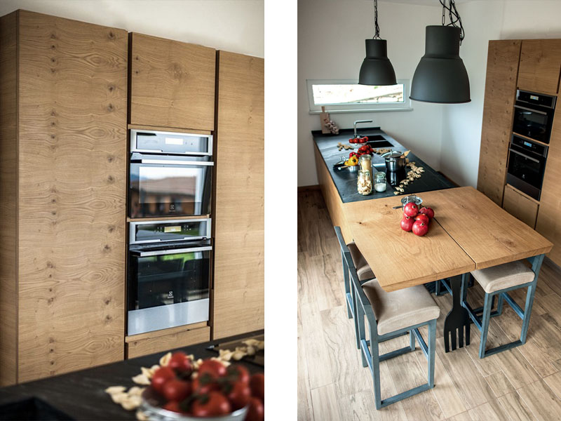 Для кухни выбран гарнитур с лаконичным названием La cucina. Однако больший интерес вызывает стол Newton из редкой древесины каури. Это сырье родом из Новой Зеландии, где долго хранилось нетронутым в болотах (от 5 до 50 тысяч лет, по различным оценкам). Как результат, материал имеет уникальную структуру, которую усердно сохраняют и подчеркивают краснодеревщики Riva 1920.
