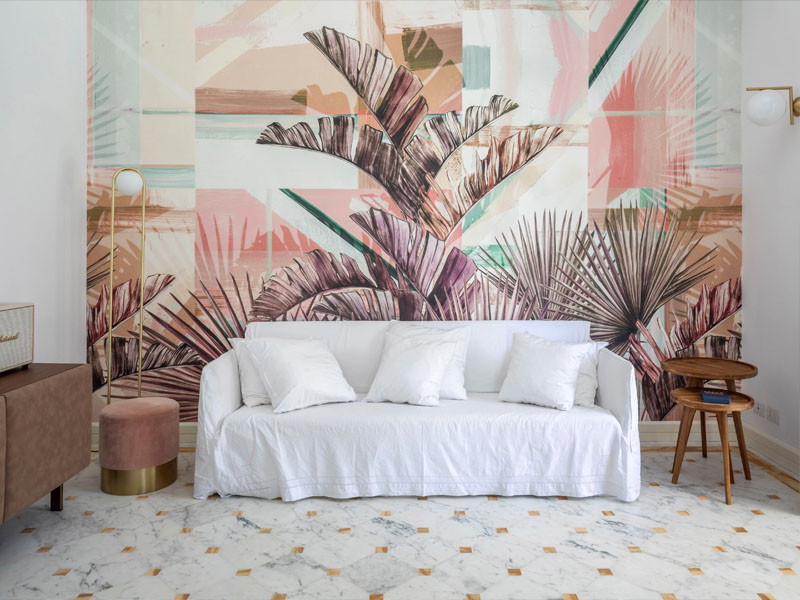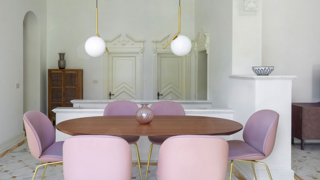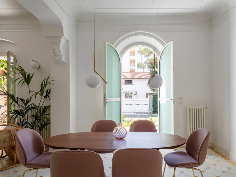 Переносимся в прибрежный итальянский городок Форте-деи-Марми, чтобы рассмотреть интерьер этих просторных апартаментов. Залитую светом гостиную украшают диван Ghost от Gervasoni, плетеные кресла и яркие обои. Гостиная плавно переходит в столовую, где над овальным столом парят два круглых подвесных светильника, выполненные из матового стекла и элементов из латуни.