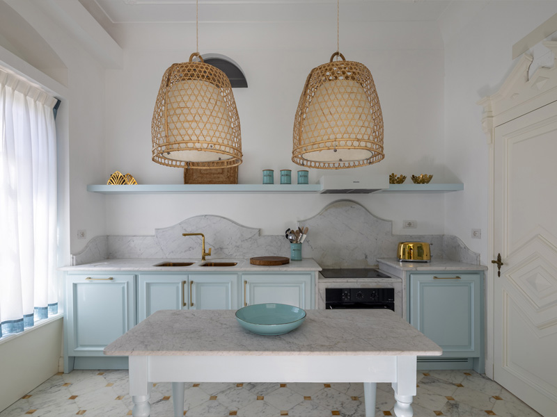 В кухне светло-голубые шкафы сочетаются с латунной фурнитурой, мраморными столешницами и полом, который помогает связать все пространство воедино. Облик интерьера завершает белоснежная штукатурка на стенах и два больших плетеных светильника.