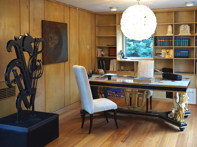 Стены кабинета отделаны натуральным деревом, а в центре расположен антикварный письменный стол. Его топ выполнен из патагонского камня, в котором смешиваются гранит и кварц – шедевр природы. Прилегающая зона снова отведена для музыки и дополнена диваном Riverside с пуфиком из молочно-белой кожи.